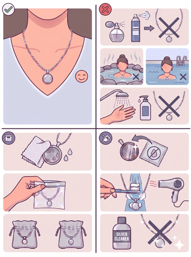 遠離化學物質: 避免接觸香水、化妝品、美髮噴霧及清潔劑。建議在打扮完畢、噴完香水後再戴上銀飾。